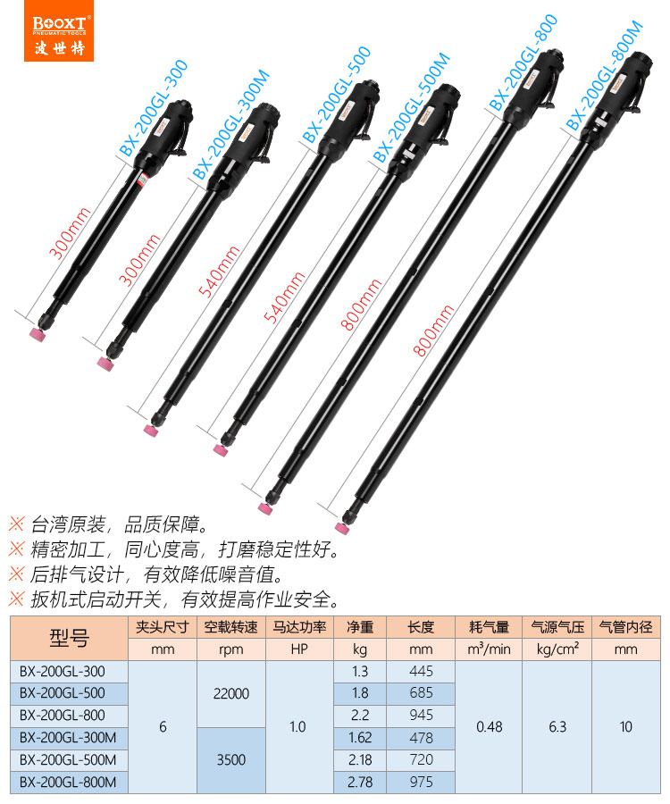 東莞市強勁五金工具有限公司提供臺灣BOOXT波世特品牌氣動工具,加長氣動磨頭機BX-200GL-800廠家直銷,首件享特價。咨詢熱線:4008301980
