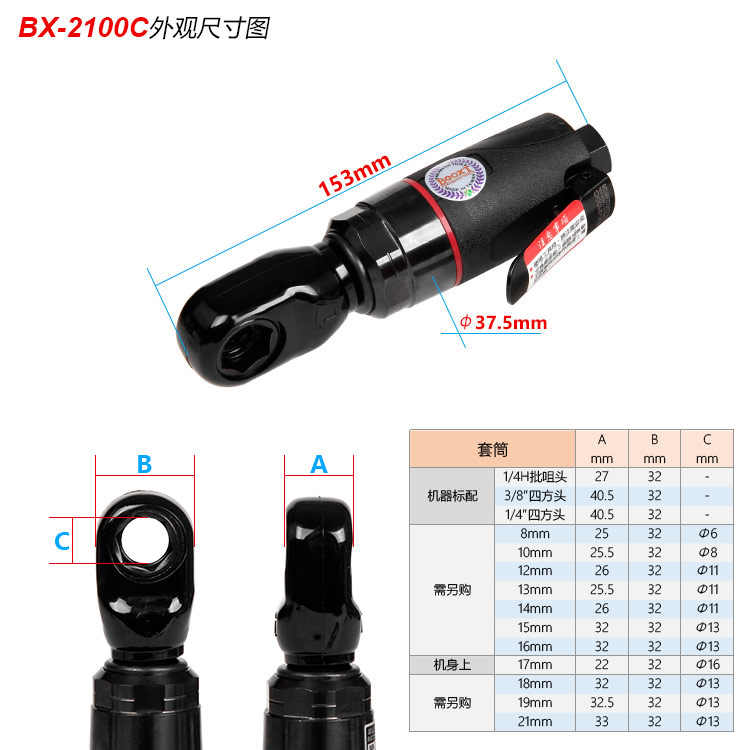 標(biāo)配套筒:1/4H(可裝風(fēng)批頭,當(dāng)彎頭風(fēng)批使用),3/8"