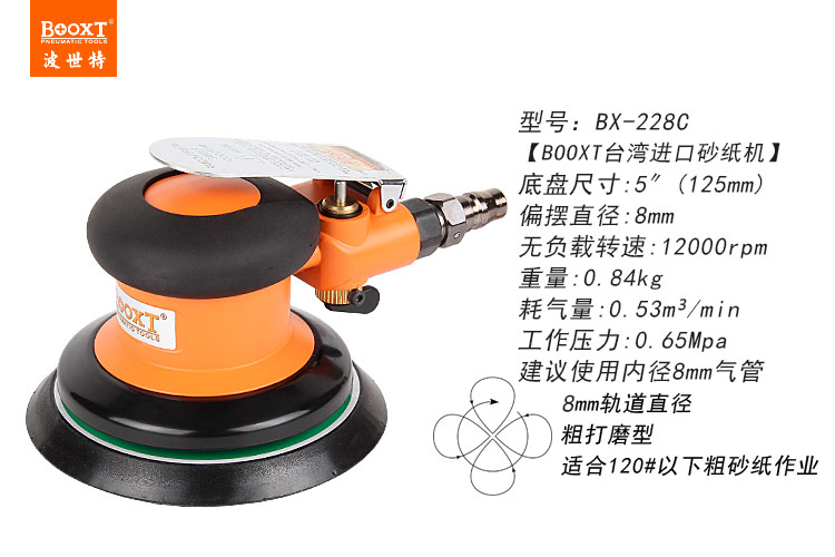 • 產(chǎn)品參數(shù): 底盤尺寸:5寸(125mm);空載轉(zhuǎn)速:12000rpm;偏擺直徑:8mm;重量:0.84kg;耗氣量:0.53m3/min;工作使用氣壓0.65Mpa,推薦使用8mm內(nèi)徑氣管,使用時(shí)多加氣動油保養(yǎng)。