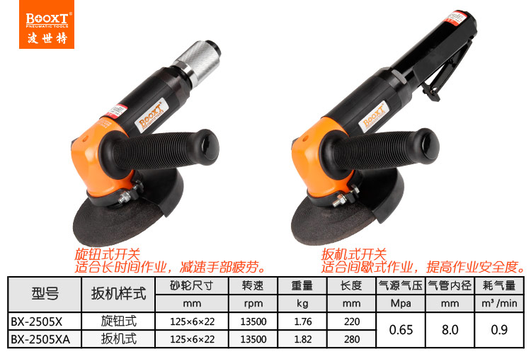 東莞市強勁五金工具有限公司提供臺灣BOOXT波世特品牌氣動工具,角向氣動砂輪機BX-2505XA廠家直銷,首件享特價。咨詢熱線:4008301980